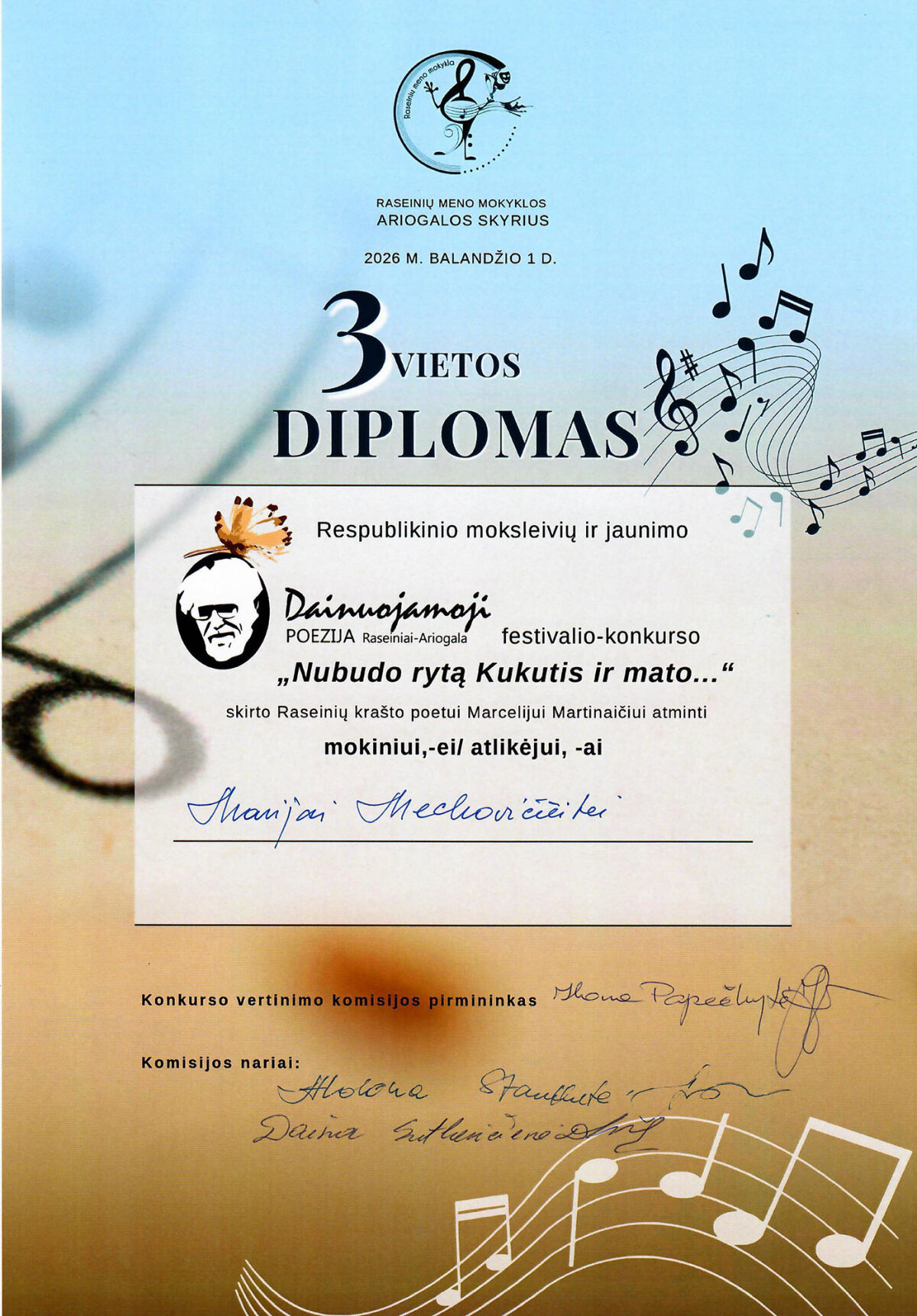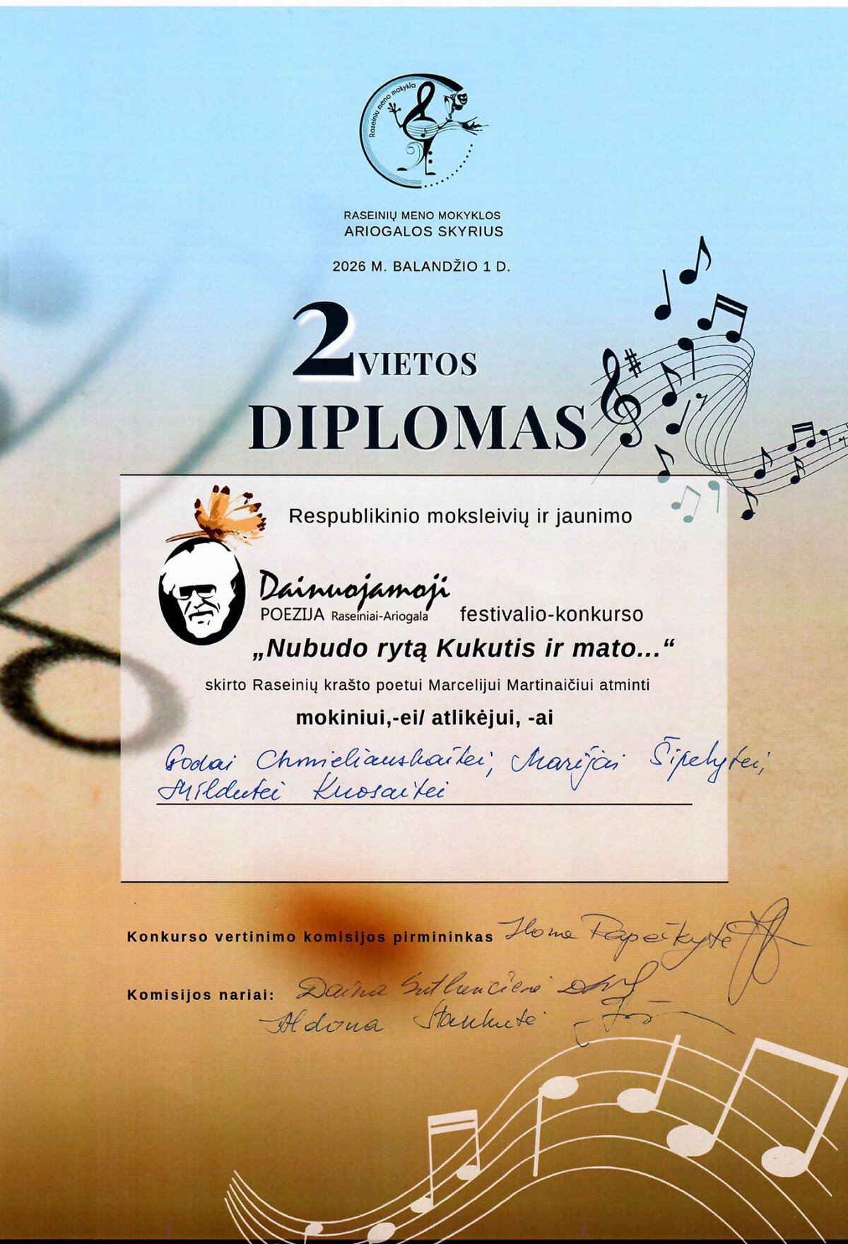 Zarasų „Ąžuolo“ gimnazijai šiame konkurse atstovavo Godos Chmieliauskaitės, Mildutės Kuosaitės ir Marijos Šipelytės trio bei solistė Marija Mechovičiūtė. Komisijos sprendimu už autorinę dainą „Tu mane atgaivink“ poeto M. Martinaičio tekstu trio pelnė II-ą vietą, solistės Marijos Mechovičiūtės autorinė daina „Sugalvok man vakarą su žiburiu“ įvertinta III-ąja vieta. Jaunosios kūrėjos apdovanotos ir M. Martinaičio kūrybos rinktinėmis, skatinant giliau pažinti poetą, kurio kūryba tapo neatsiejama Lietuvos literatūros dalimi ir iki šiol įkvepia naujas skaitytojų kartas.
