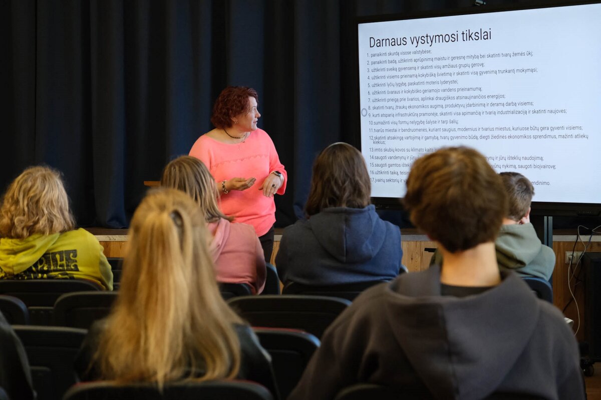 Dar viena pamokos veikla, kuri skatino mokinių kūrybiškumą bei sąmoningą žvilgsnį į pasaulinius iššūkius, buvo susijusi su 17 Darnaus vystymosi tikslų (DVT) analizavimu. Mokiniai turėjo porose išsirinkti vieną tikslą, kuris jiems atrodo svarbiausias ar aktualiausias jų pačių gyvenimui, aplinkai, ir sukurti jam atitinkantį vizualų simbolį.