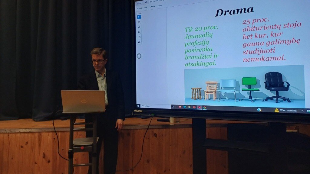 Lektorius savo pranešimą pradėjo dėmesį prikaustančia statistika: tik apie 20 proc. jaunuolių profesiją pasirenka brandžiai ir atsakingai, o net ketvirtadalis abiturientų studijas renkasi atsitiktinai – ten, kur pavyksta įstoti į valstybės finansuojamą vietą. Šie skaičiai atskleidžia ne tik pasirinkimų paviršutiniškumą, bet ir sisteminę problemą – nepakankamą dėmesį savęs pažinimui bei sąmoningam karjeros planavimui.