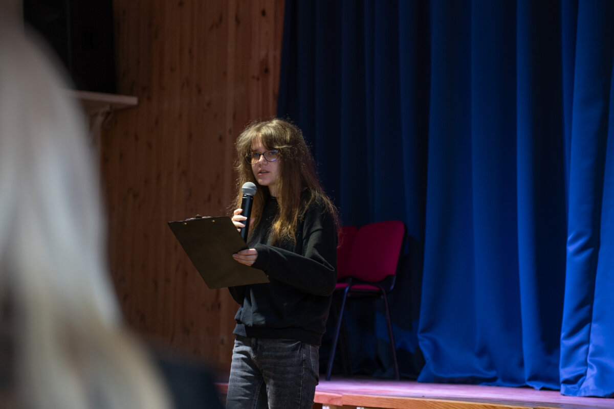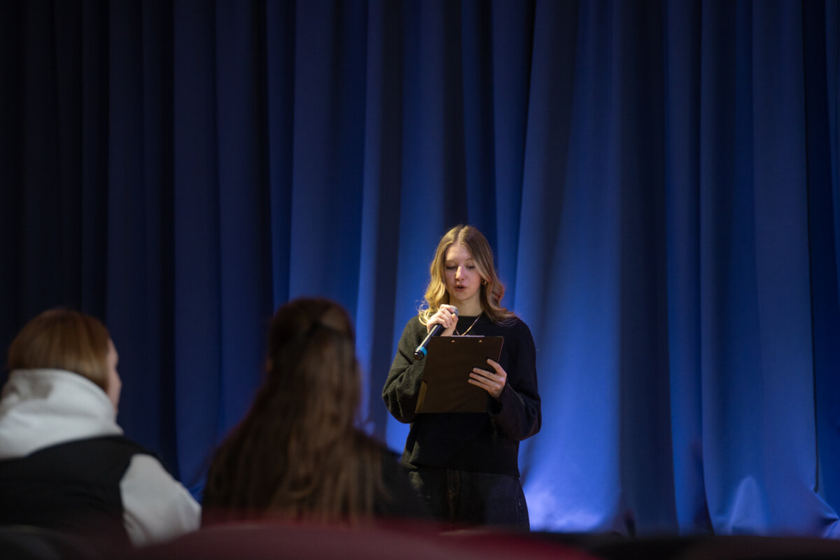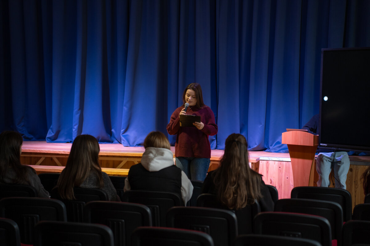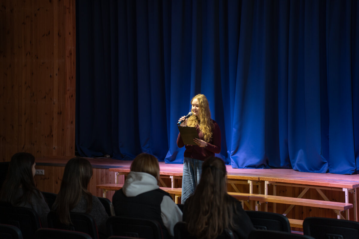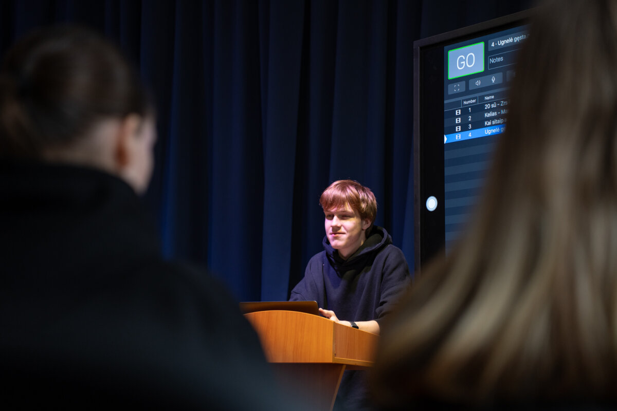 Praėjusią savaitę tris dienas gimnazijos aktų salėje rengėme kūrybines pertraukas – kvietėme gimnazijos bendruomenę pasižiūrėti jaunimo sukurtų eilėraščių ekranizacijų. Tai Lietuvos mokinių konkurso „Kuriu – vaizdu, garsu, žodžiu“ darbai, su kuriais susipažinti ir balsuoti už labiausiai patikusį pasiūlome jau ketvirtus metus. Šiemet peržiūrai buvo pateikta dešimt įvairių eilėraščių ekranizacijų, kurių autoriai – mūsų gimnazistų komandos, taip pat Vilniaus „Laisvės“ gimnazijos, Trakų Vytauto Didžiojo gimnazijos, Zarasų Pauliaus Širvio progimnazijos ir Ignalinos r. Didžiasalio „Ryto“ gimnazijos mokiniai.
