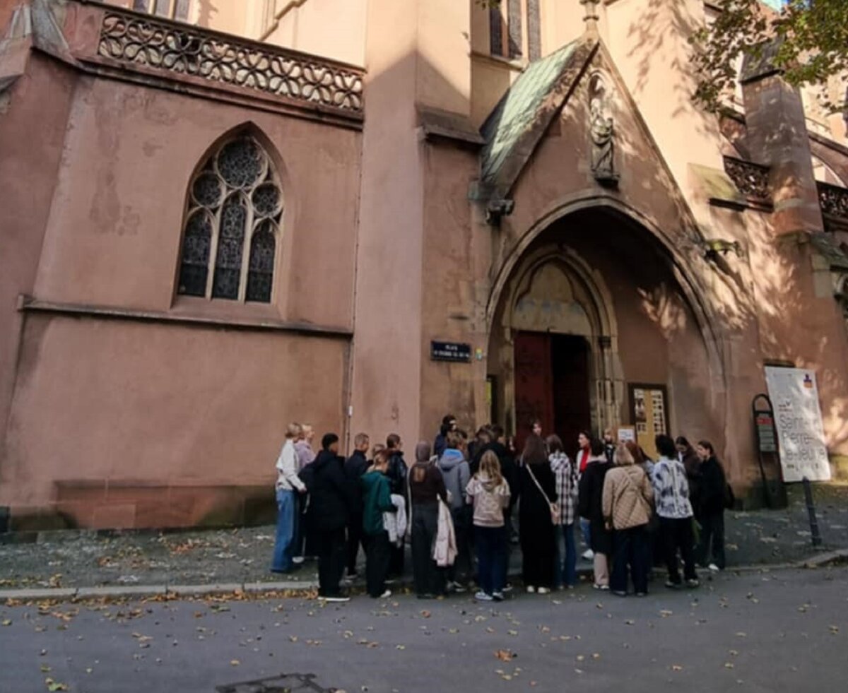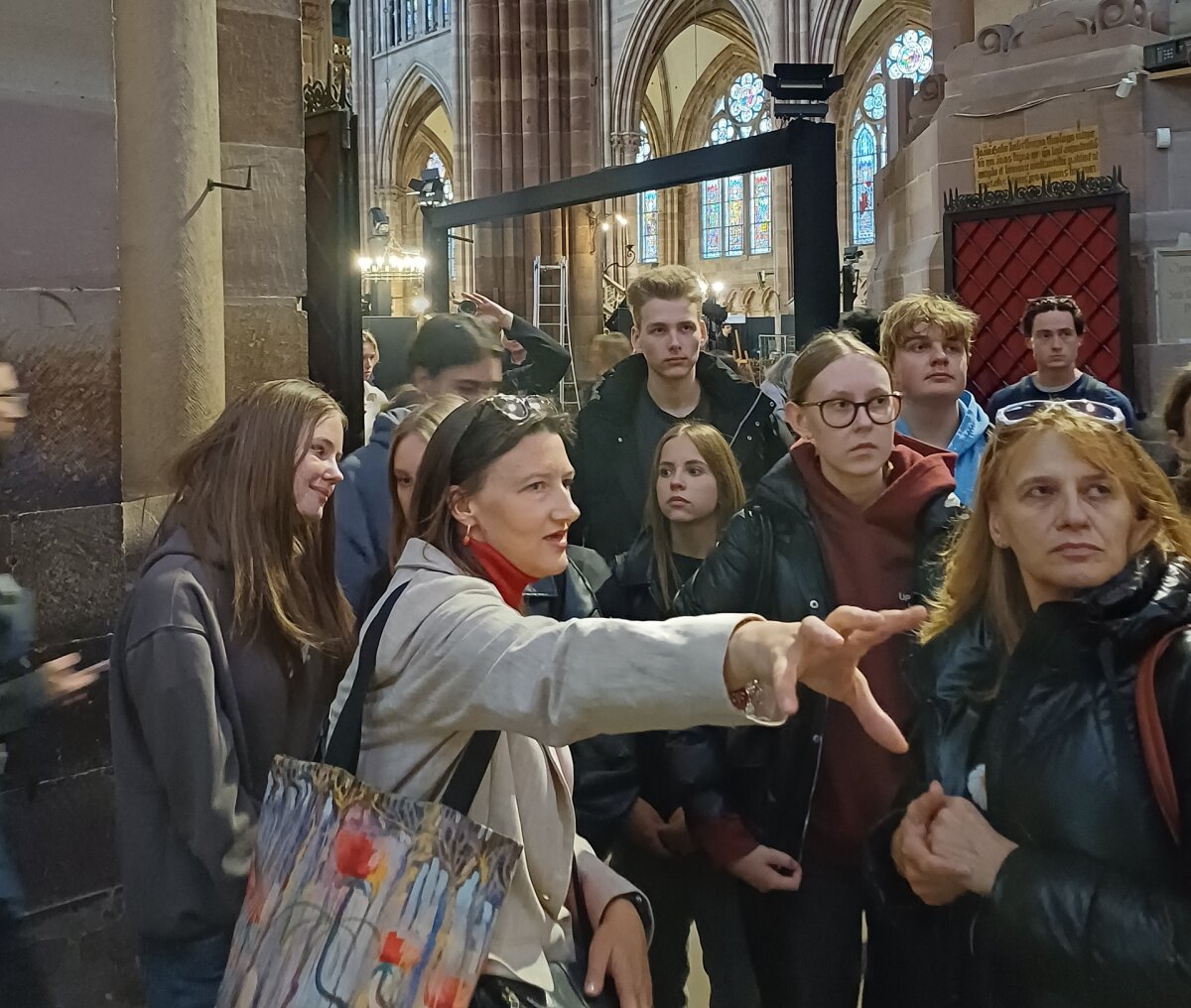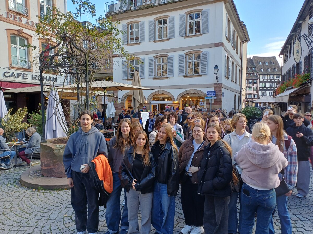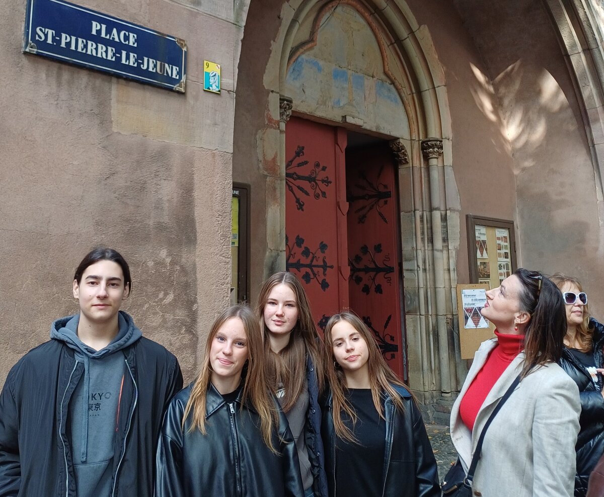 Susitikę su lietuvių bendruomenės vadove Jolita Šilanskiene, pirmiausia mokiniai aplankė garsiąją Strasbūro katedrą, kuri stebino savo didybe ir nepakartojamu grožiu. Katedros viduje pamatėme įspūdingą astronominį laikrodį – tikrą meno ir mokslo šedevrą. Taip pat lankėmės Šv. Petro Naujojoje protestantų bažnyčioje. Čia apžiūrėjome Lietuvai ypatingą gotikinę freską, kuri vadinasi „Europos tautų žygis prie kryžiaus“. Ji vaizduoja Europos tautų žygį į krikščionybę. Freskoje pavaizduota 15 Europos tautų, o paskutinė figūra simbolizuoja Lietuvą, nes mes vėliausiai priėmėme šią religiją. Po įdomaus pasivaikščiojimo nepraleidome progos pasimėgauti neapsakomai gardžiais eklerais, nes visiems žinomas nuostabus prancūziškų gardumynų skonis.