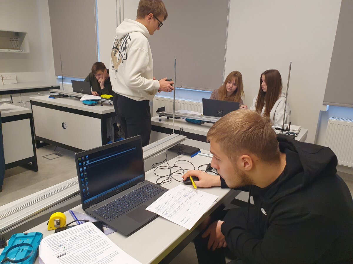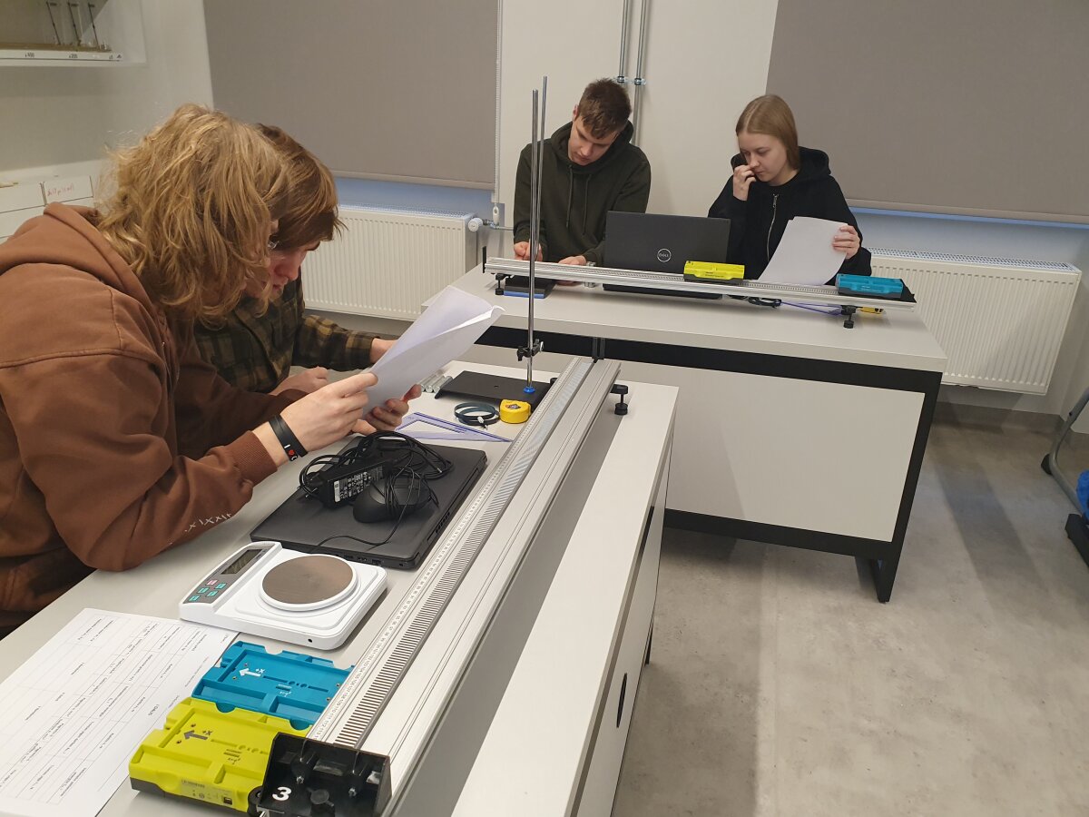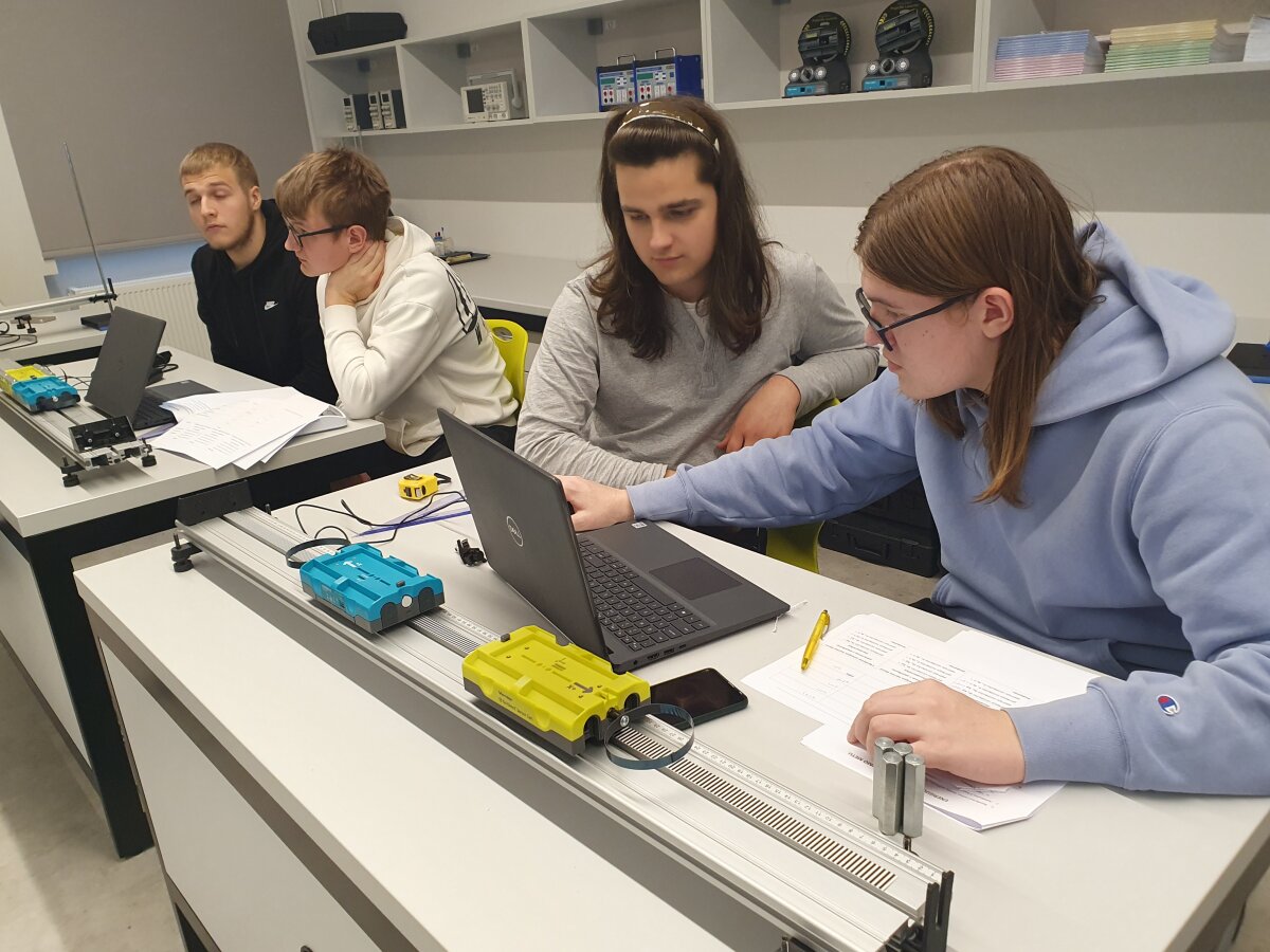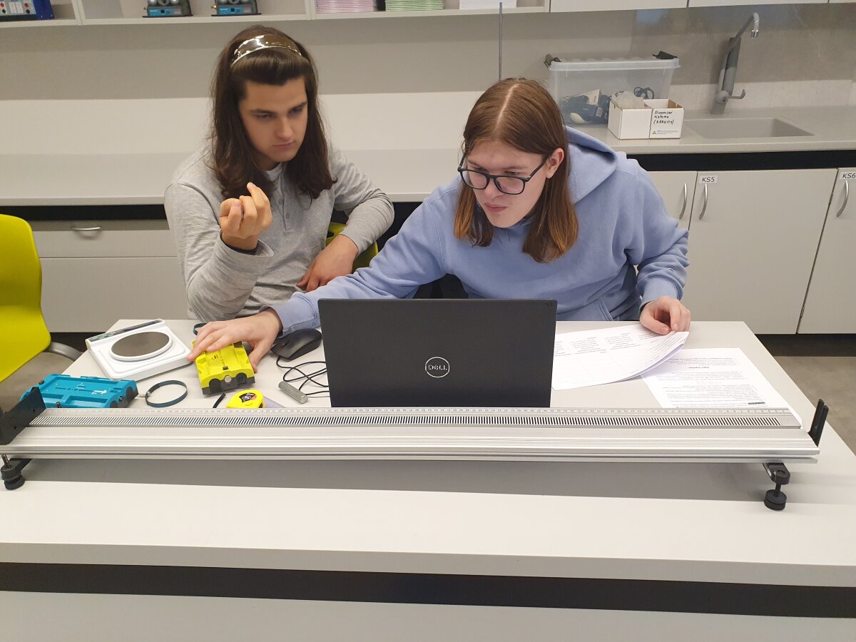 Zarasų Ąžuolo gimnazijos 11 klasės mokiniai fizikos pamokų metu atliko tiriamąjį darbą „Dinamika ir kinematika, jėgos impulsas“, kuriame gilinosi į judančių kūnų sąveiką ir nagrinėjo, kaip jėgos impulso dydis priklauso nuo kūno masės, judėjimo greičio bei sąveikos trukmės susidūrimo metu. Praktinė veikla vyko gamtamokslinėje laboratorijoje, integruojant fizikos, matematikos ir informacinių technologijų žinias.
