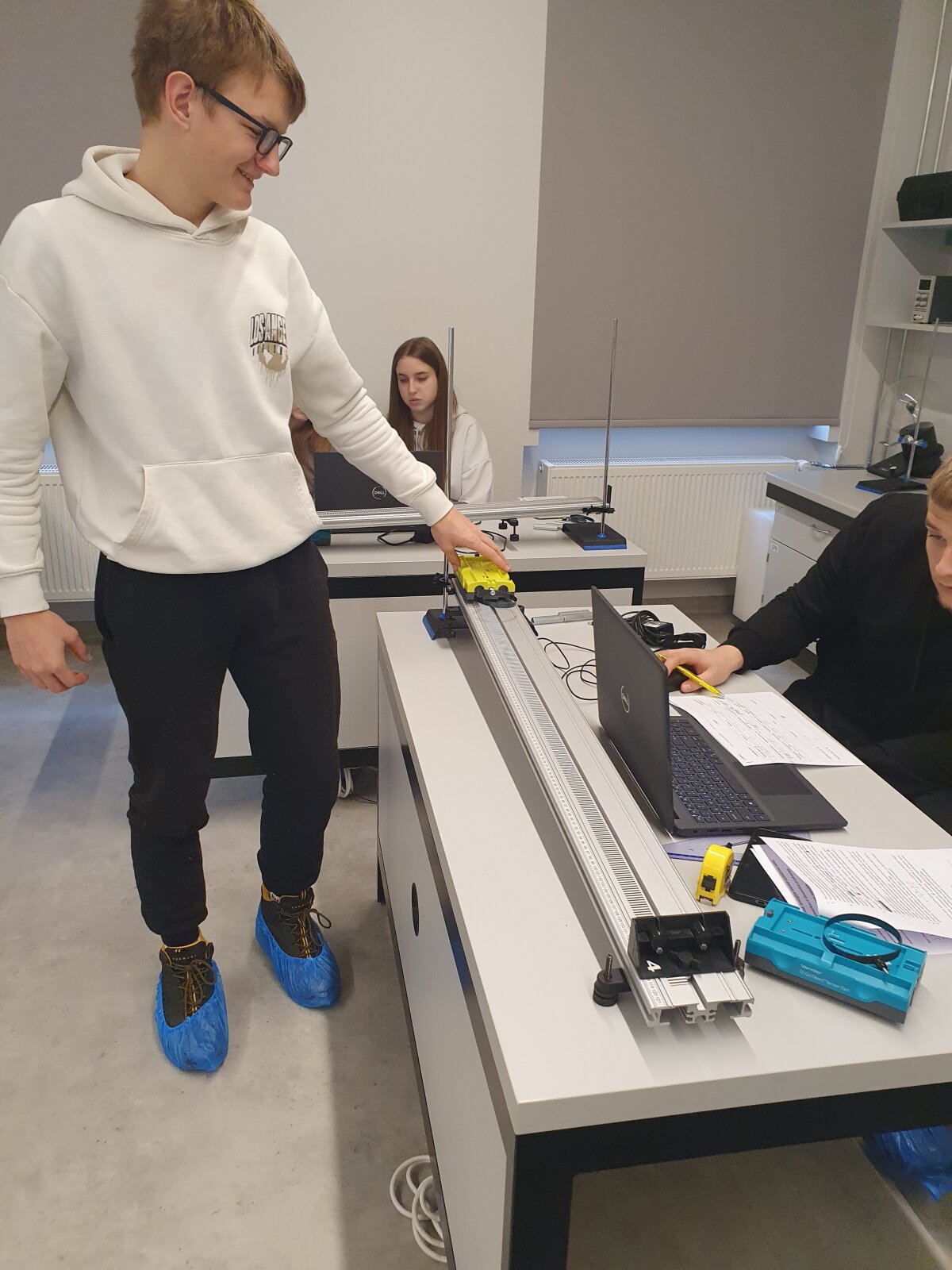 Tiriamojo darbo pradžioje mokiniai dalyvavo teorinėje diskusijoje, kurios metu buvo aptarti pagrindiniai kinematikos ir dinamikos dėsniai, energijos tvermės principas bei jų taikymas realiose situacijose – transporto saugoje, sporte ir technikoje. Tai sudarė pagrindą tolimesniems eksperimentiniams tyrimams ir padėjo suprasti fizikos dėsnių praktinę reikšmę.