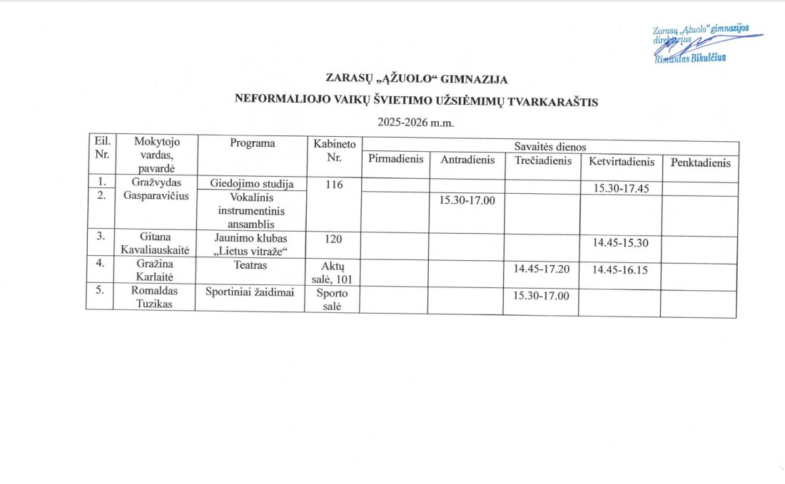 2025-2026 m.m. neformaliojo vaikų švietimo programų tvarkaraštis